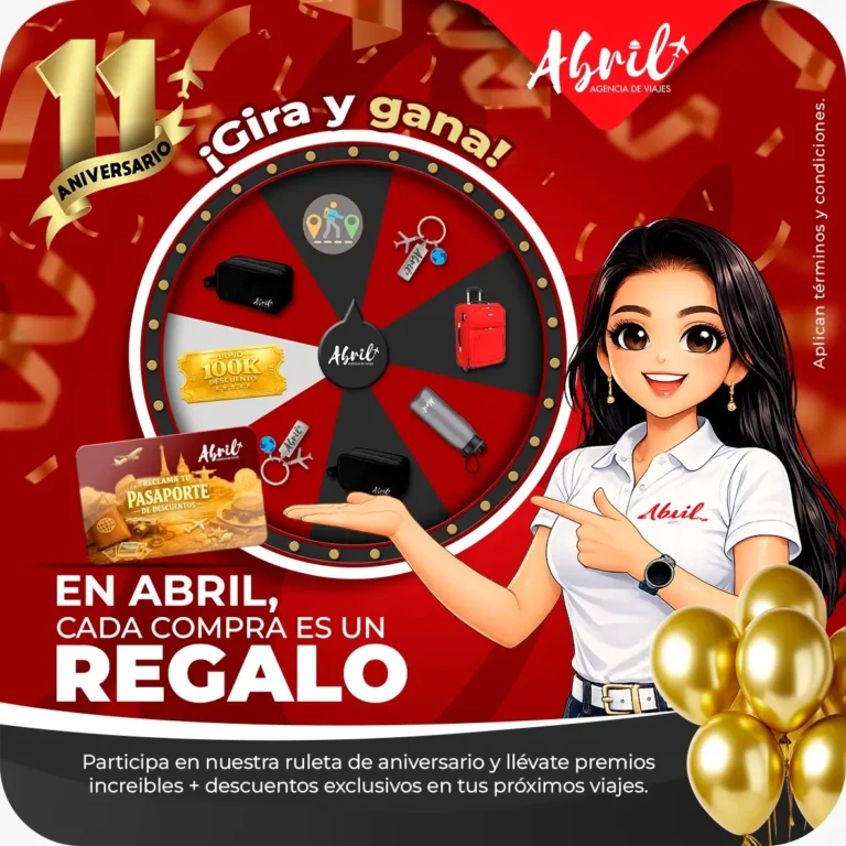 La Ruleta de Premios “Aniversario Abril #11” es una actividad promocional organizada por Abril Agencia de Viajes como beneficio adicional para clientes con reserva confirmada dentro de la campaña de aniversario.