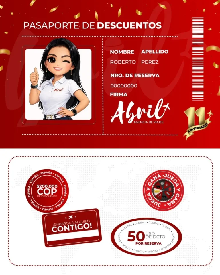 El Pasaporte de Descuentos Abril 11 Años es una campaña promocional de carácter comercial organizada por Abril Agencia de Viajes, mediante la cual los clientes que cumplan las condiciones aquí establecidas podrán acceder a descuentos directos sobre productos turísticos seleccionados.